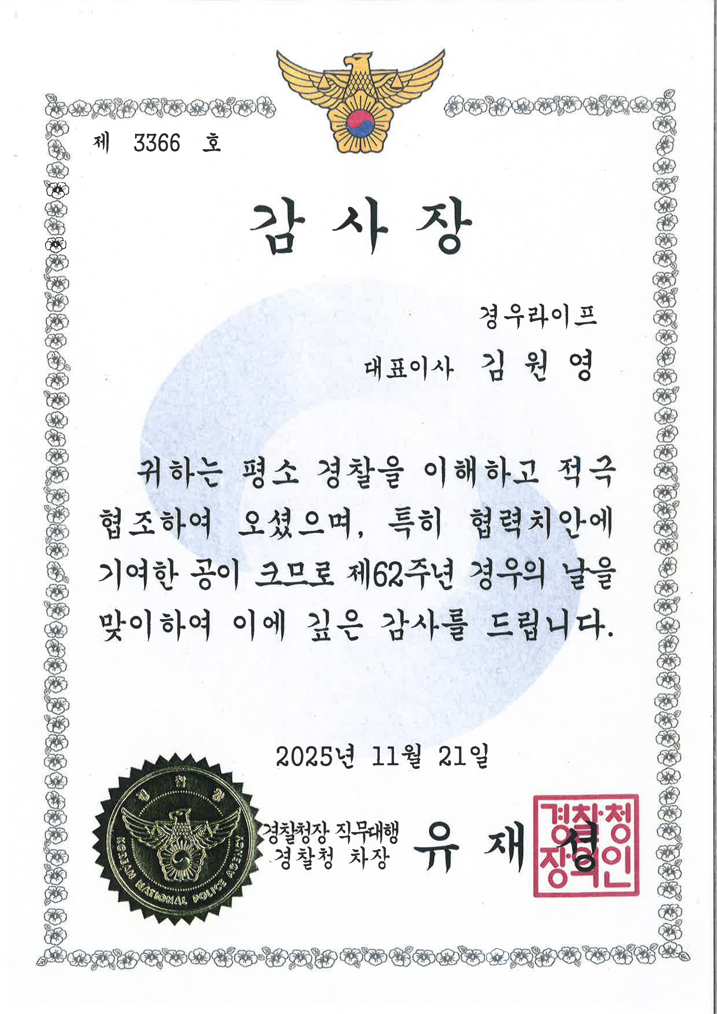 제 62주년 경우의날 감사장